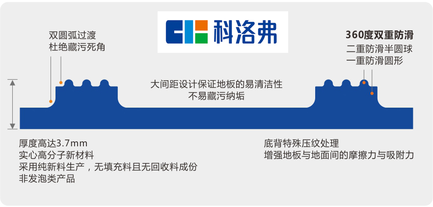 特別適用特點(diǎn):雙層圓球?qū)@阑鎸釉O(shè)計(jì),加強(qiáng)地面與腳底摩擦力,防止地面因積水打滑。防水防霉抗菌無異味,防摔傷,提供高彈力高舒適性地面感受。