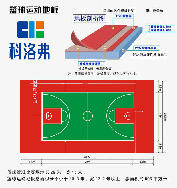 籃球運(yùn)動(dòng)起源于美國(guó)。籃球地板多使用10年至20年間的美國(guó)楓木地板鋪設(shè)而成,但是由于其造價(jià)昂貴,國(guó)內(nèi)多數(shù)場(chǎng)館均采用國(guó)產(chǎn)楓木地板鋪設(shè)。近年來(lái),隨著塑膠地板技術(shù)進(jìn)入我國(guó)和塑膠地板行業(yè)的興起,籃球塑膠運(yùn)動(dòng)地板在國(guó)內(nèi)已經(jīng)普遍被大眾所接受,因其良好的運(yùn)動(dòng)特性,深受廣大球員的喜愛(ài)。籃球塑膠運(yùn)動(dòng)地板在國(guó)內(nèi)還是一個(gè)新型的地板類型,具有很大的發(fā)展空間。籃球運(yùn)動(dòng)地板板材規(guī)格通覽: 單卷寬1.8m 卷長(zhǎng)20m 面層紋理:楓木紋/寶石紋/布紋 總厚度:4.5mm/其他 場(chǎng)地線總長(zhǎng)寬:28mX15m 地板總長(zhǎng)寬:40mX20m 地板總面積:800㎡