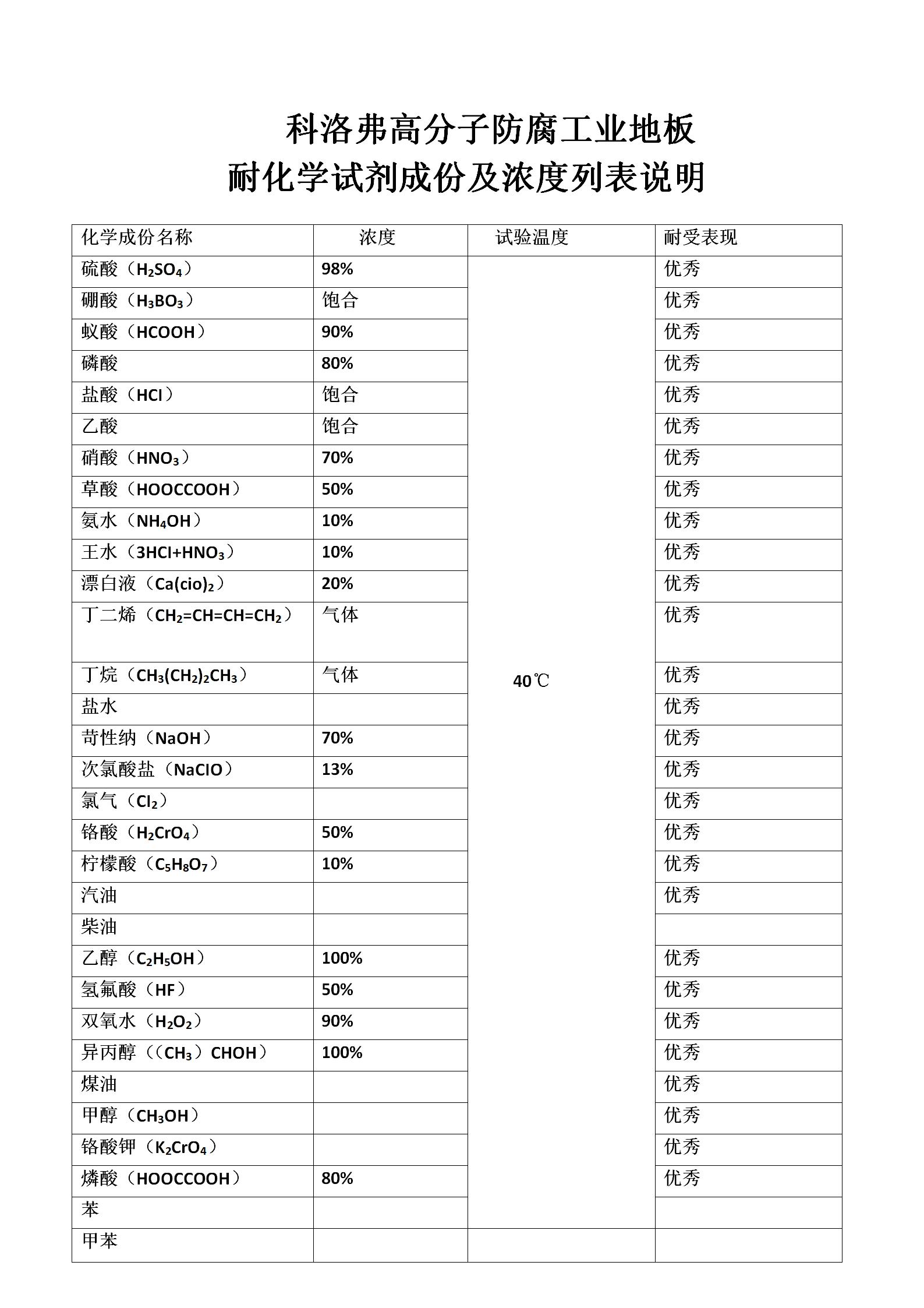 科洛弗高分子防腐工業(yè)地板可耐受的各種化學試劑濃度: