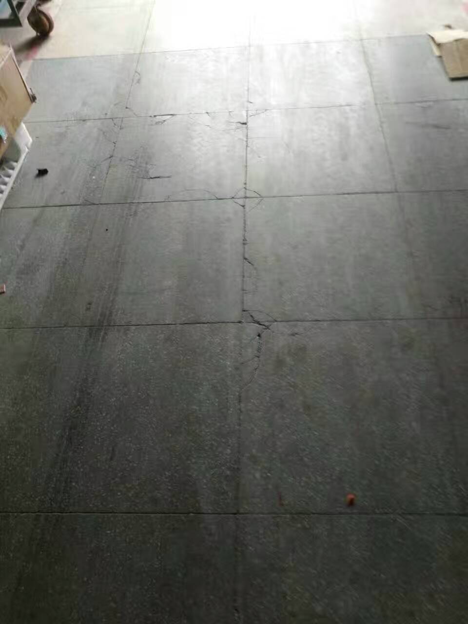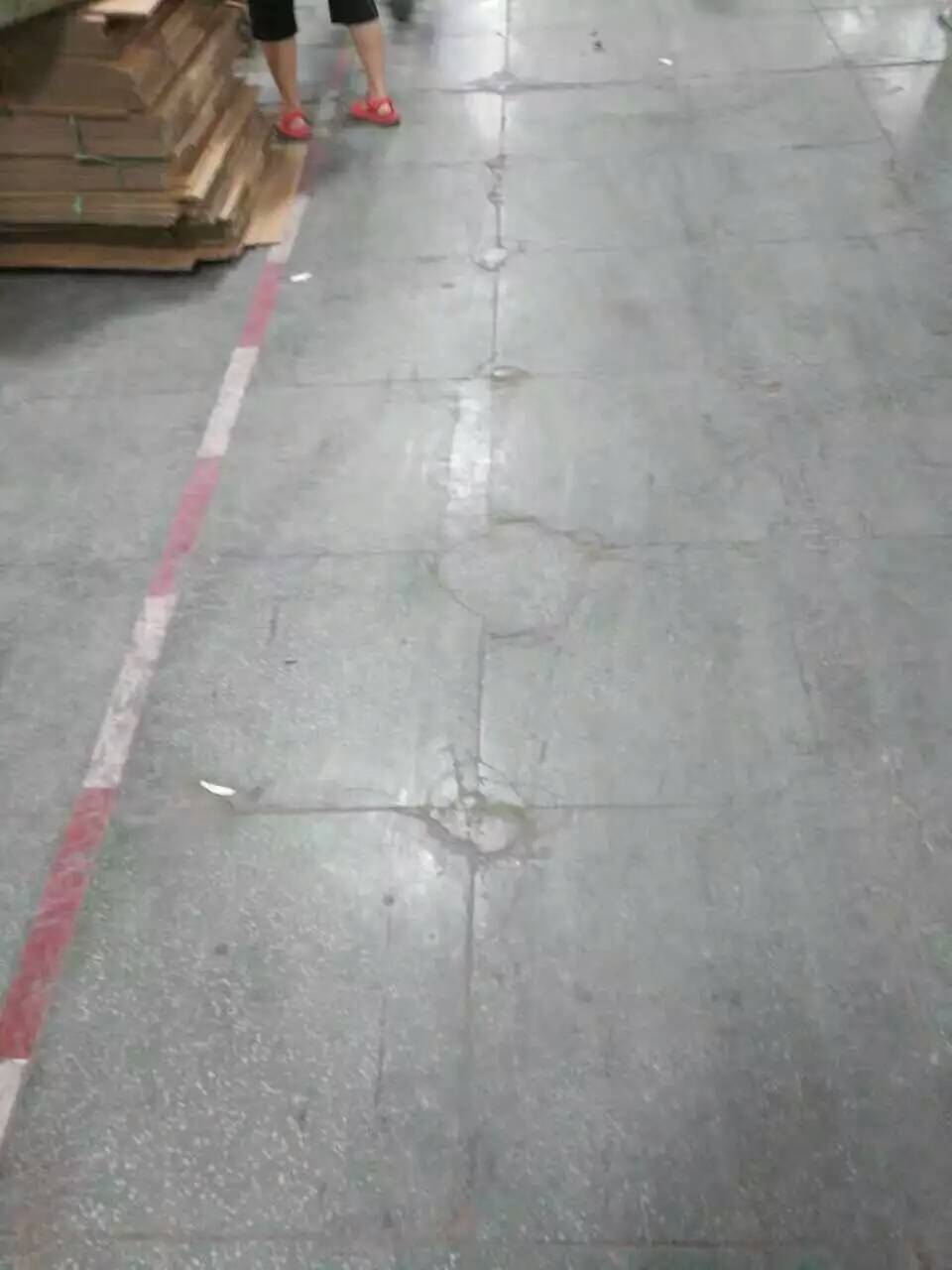 從圖上我們看到這個廠房的地面已經(jīng)開裂,并且嚴(yán)重影響美觀與日常工作需求了,從地面的損壞程度來看,這個地面應(yīng)該長時間受到重壓,地上有過車留下的刮痕,說明原地面在耐磨耐刮特性上欠缺,抗重壓重載方面欠缺。