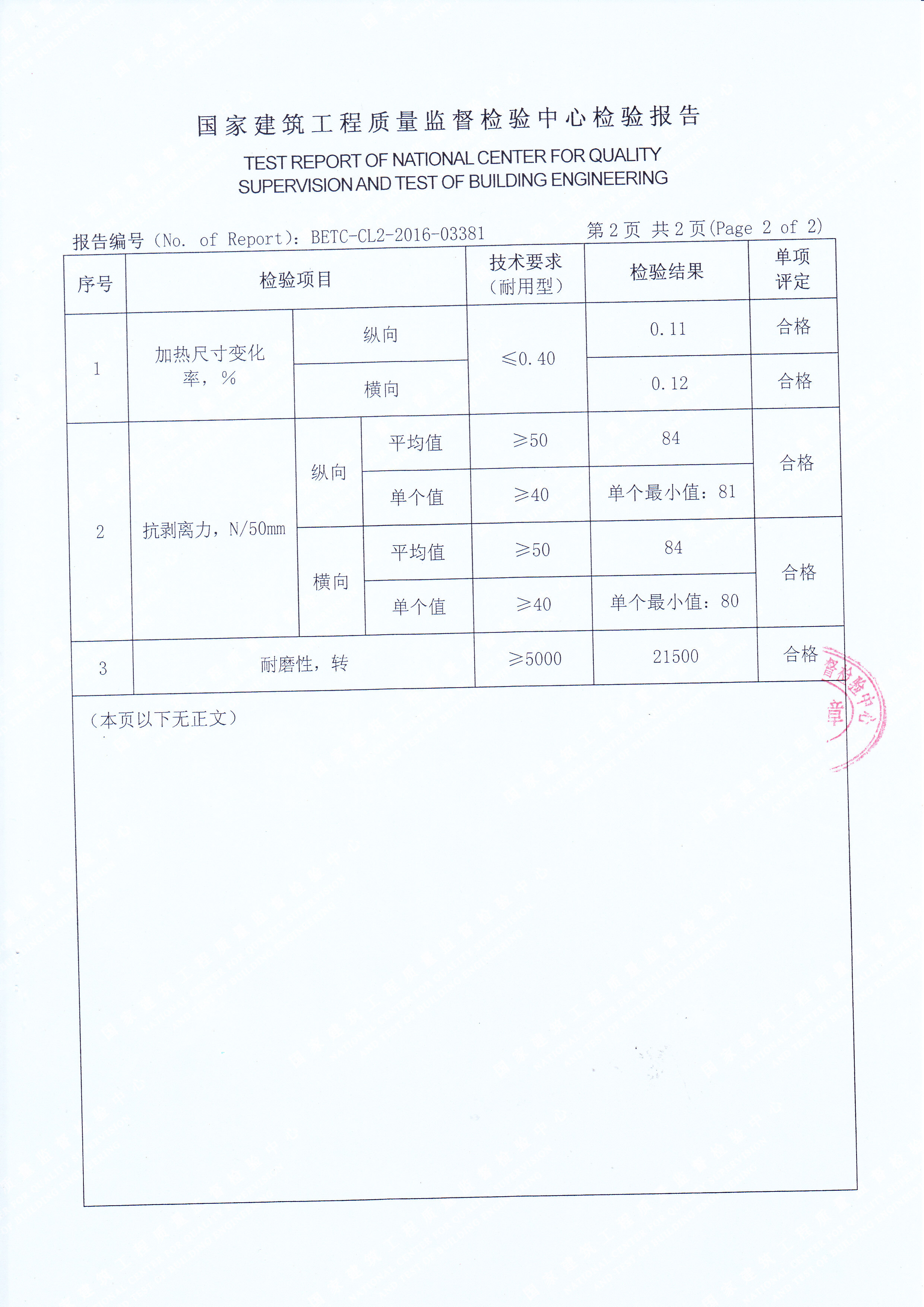經(jīng)國家建筑工程質(zhì)量監(jiān)督檢驗(yàn)中心檢測,科洛弗高分子工業(yè)地板耐磨轉(zhuǎn)數(shù)達(dá)到21500轉(zhuǎn),這個(gè)數(shù)據(jù)代表什么含義呢?那我們來看看國家對地板耐磨性檢測的要求和標(biāo)準(zhǔn):普通型3000轉(zhuǎn)達(dá)標(biāo),耐用型5000轉(zhuǎn)達(dá)標(biāo),那么科洛弗高分子工業(yè)地板耐磨性是普通型的7倍耐用型的4倍,所以科洛弗高分子工業(yè)地板應(yīng)用于工業(yè)廠房地面將是最佳選擇,科洛弗高分子工業(yè)地板的耐磨性、環(huán)保性、可修復(fù)性、抗腐蝕性、抗重載性優(yōu)勢是其它工業(yè)地面材料所不能比擬的