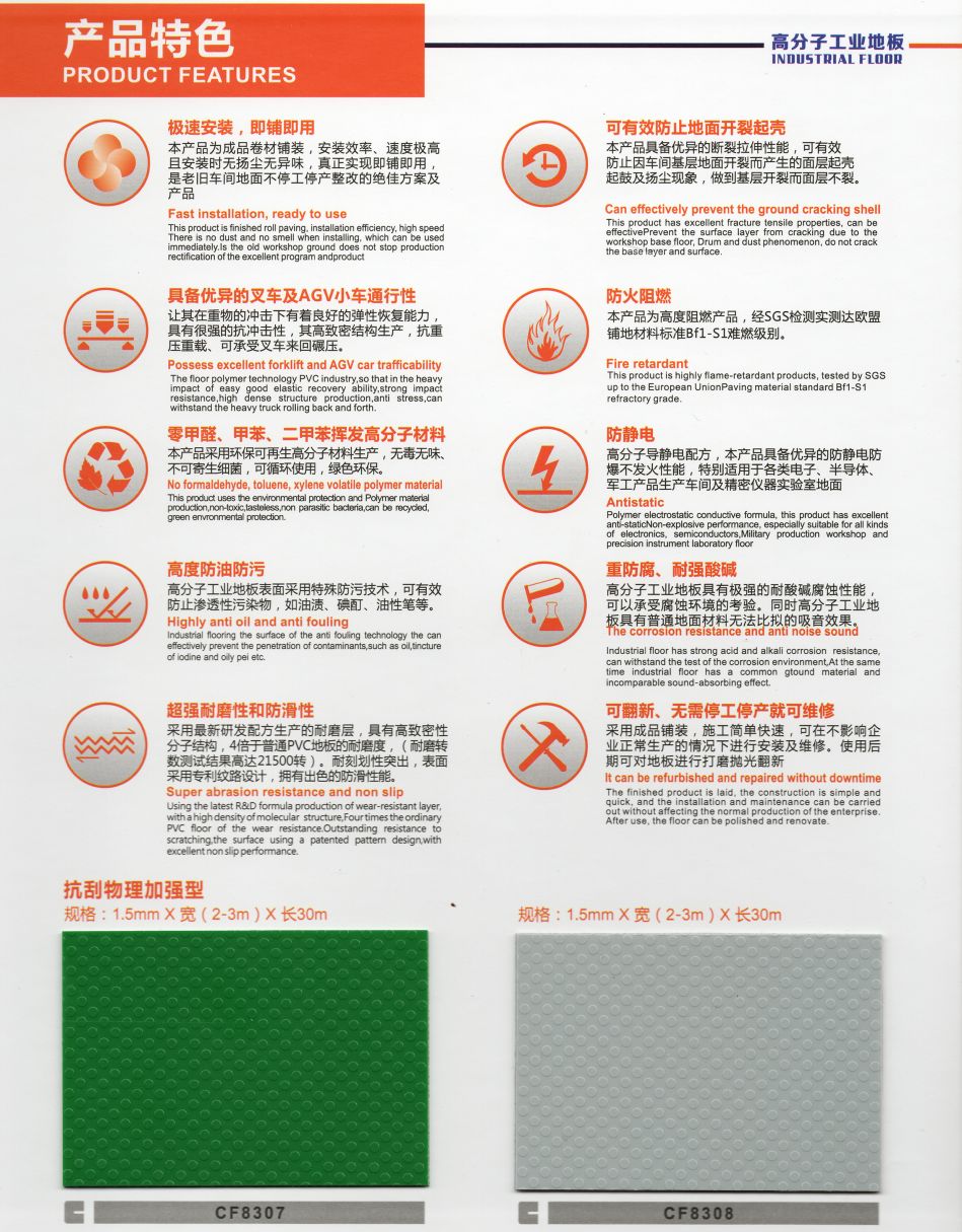 6 綠色環(huán)保:生產(chǎn)高分子工業(yè)地板主要原料不含放射性元素,是綠色環(huán)保的新型地面裝飾材料。